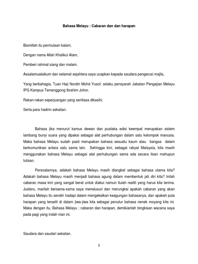 Teks Pengucapan Awam Bahasa Melayu Cabaran Dan Harapan