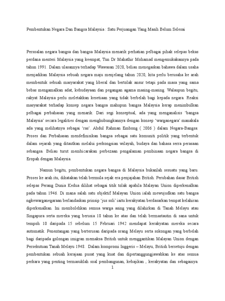 Menurut Hargue dan Harrop bagi membentuk negara bangsa sesebuah negara itu perlu melalui empat peringkat terlebih dahulu iaitu bina negara. Secara tidak langsung negara-negara anggota yang kaya dengan sumber ekonomi boleh membantu negara-negara anggota yang miskin dan kekurangan sumber ekonomi sekaligus ia dapat meningkatkan pembangunan. 7052021 Konsep negara bangsa merupakan siulan polisi utama bekas Perdana Menteri kita bermula dari era Tunku Abdul Rahman Wawasan 2020 oleh Tun Dr Mahathir dan gagasan 1 Malaysia oleh YAB Perdana Menteri Malaysia Dato Seri Najib Abdul RazakKesinambungan pembinaan negara bangsa berteraskan masyarakat multietnik di Malaysia berterusan sehingga hari inikonsep negara bangsa telah mewujudkan banyak percanggahan.
