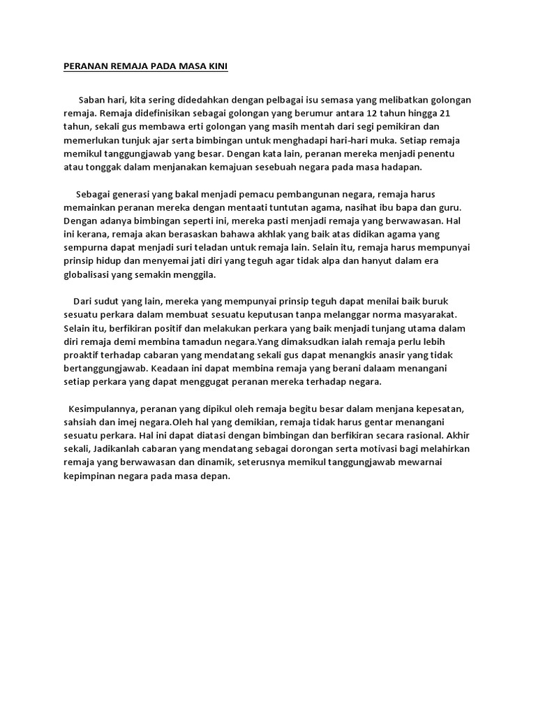 13022014 peranan remaja pada masa kini Saban hari kita sering didedahkan dengan pelbagai isu semasa yang melibatkan golongan remaja. Sebagai kesimpulan remaja merupakan aset negara yang amat penting dan bakal memimpin negara pada masa hadapan. Pengurusan masa turut menjadi cabaran yang besar kerana remaja kini terlalu banyakmenghabiskan masa dengan alam maya.
