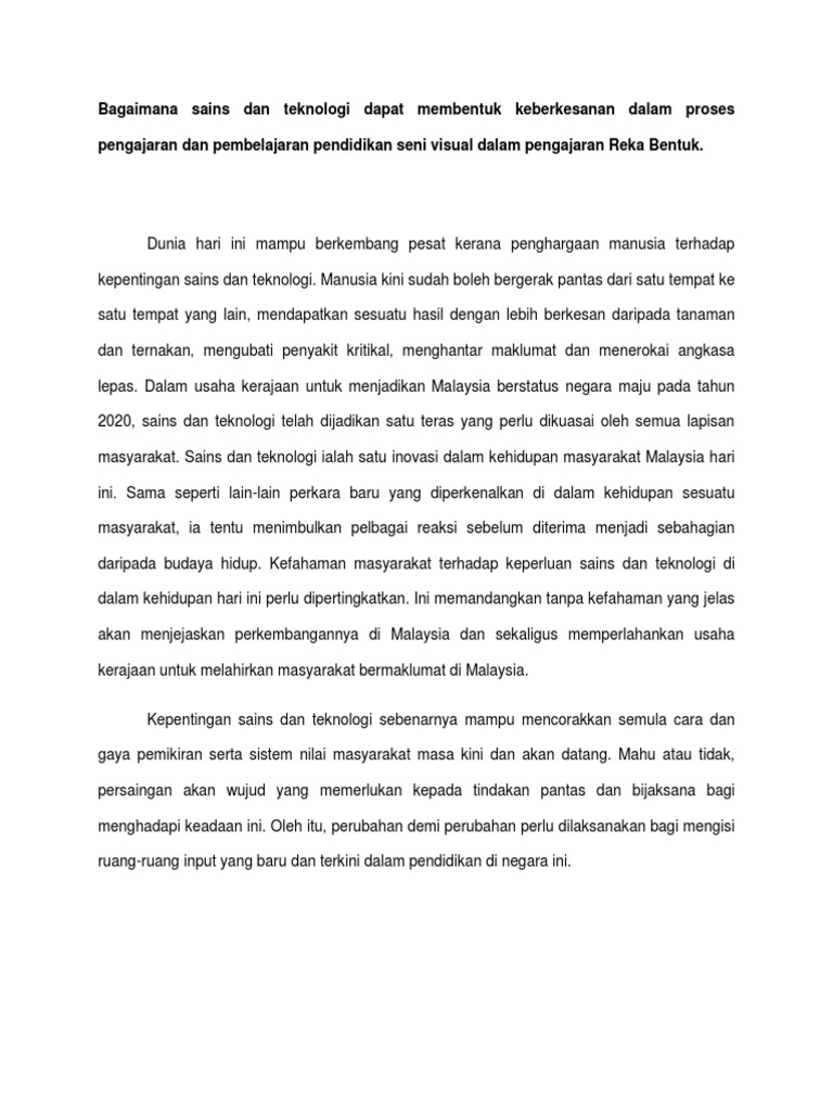 29062009 Usaha menerbitkan buku yang berjudul Sains dan Teknologi Dalam Pembinaan Tamadun. Cabaran keenam daripada sembilan strategi mencapai wawasan 2020 adalah menyatakan bahawa Malaysia mesti mewujudkan masyarakat yang saintifik dan progresif masyarakat yang inovatif yang bukan sahaja menjadi pengguna kepada teknologi malah menjadi penyumbang kepada dunia sains dan teknologi pada masa depan. 30042012 Kejayaan Malaysia dalam Bidang Sains dan Teknologi.