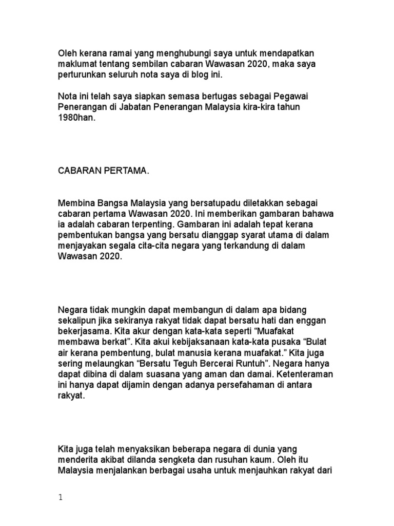 View Cabaran ketujuh dalam Wawasan 2020doc from ECON EDUCATION at SJK T Ladang Walbrook. Wawasan 2020 pendahuluan satu konsep yang telah dibentangkan oleh yab perdana menteri di mesyuarat majlis perdagangan malaysia pada 28 februari 1991. 30122019 Wawasan 2020 bermatlamat mewujudkan Malaysia sebagai sebuah negara bersatu dengan masyarakat Malaysia yang yakin mempunyai nilai moral dan etika yang kukuh hidup dalam masyarakat yang demokratik liberal dan bertolak ansur penyayang adil dari segi pengagihan ekonomi progresif dan makmur mempunyai penguasaan sepenuhnya terhadap ekonomi yang.