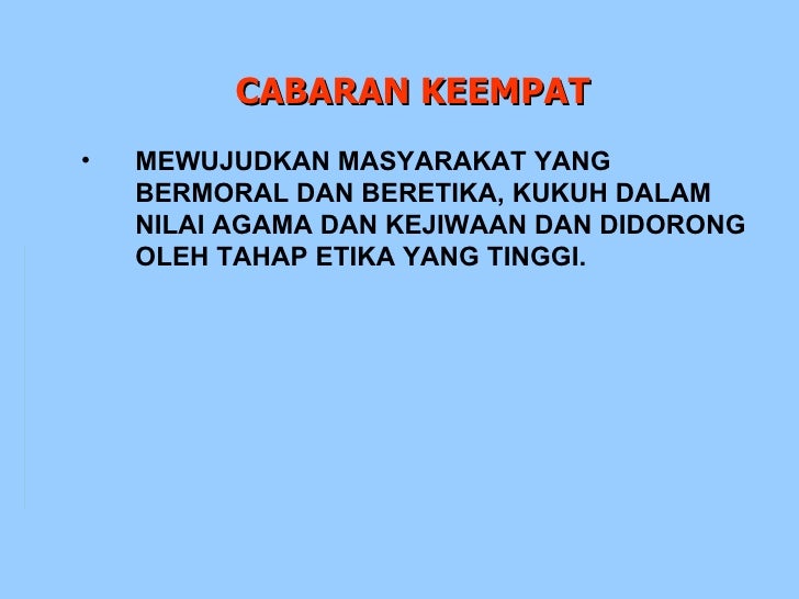Cabaran wawasan 2020. B Mengenalpasti bidang-bidang yang diperluaskan paradigma lama dan menerima paradigma yang baru. Tun Dr Mahathir telah menggariskan sembilan cabaran strategik yang Malaysia mesti atasi untuk mencapai Wawasan 2020. Yg berjiwa bebas tenteram dan maju dgn keyakinan terhadap diri sendiri bangga dgn apa yg di capai serta berani menghadapi pelbagai mslh.