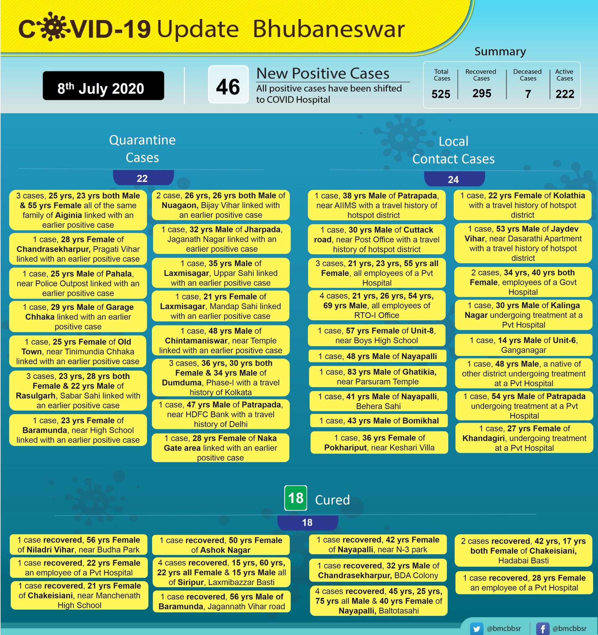 Odisha capital Bhubaneswar reported 1196 more Covid19 positive cases today Local contact cases. As many as 8401 COVID-infected patients recovered from the infection on Friday. 2 days ago BHUBANESWAR.