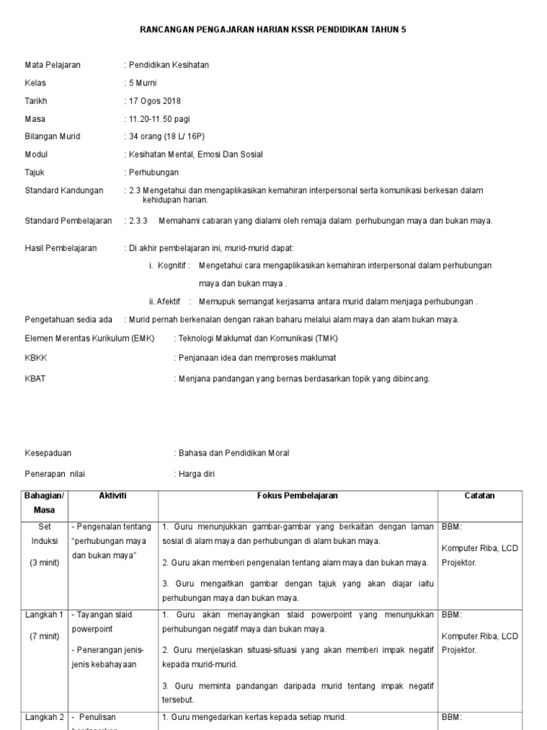 Rancangan Pengajaran Harian Kssr Pk Tahun 5