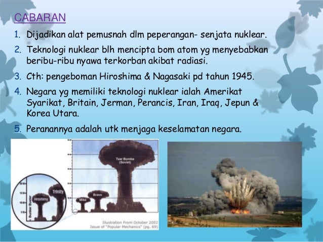 Ancaman senjata pemusnah besar-besaran Weapon of Mass destruction-WMD Pembangunan teknologi nuklear Teknologi maklumat dan komunikasi Kemajuan nanoteknologi Perkembangan sains forensic Pembangunan inovasi Perubahan iklim. Realiti dan cabaran pendahuluan abad ke 20 membawa kepada bermulanya perkembangan pesat sains dan teknologi maklumat yang luar biasa.
