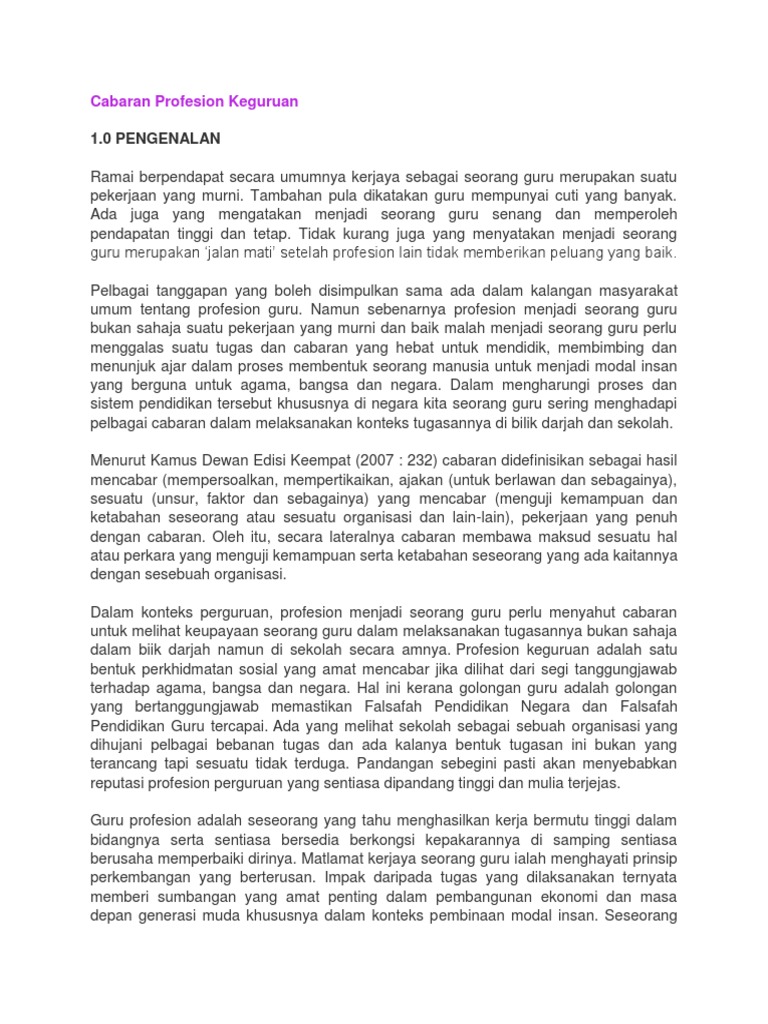 CABARAN SEORANG GURU MASA KINIbr Kejayaan dan keberkesanan pendidikan banyak berkait rapat dengan kesedaran keinsafan dan tanggungjawab guru sebagai pendidik di samping mempunyai kelengkapan keilmuan yang cukup dan sahsiah luhur. 18042012 Cabaran Profesyen Perguruan Pada Masa Kini. Tantangan Guru Masa kini dalam Undang-UndangDisahkannya Undang-Undang Nomor 142005 tentang Guru dan Dosen tampaknya hendak mengembalikan citra dan wibawa guru sebagaimana pernah terjadi di masa lalu melalui peningkatan kesejahteraan dan menjadikannya.