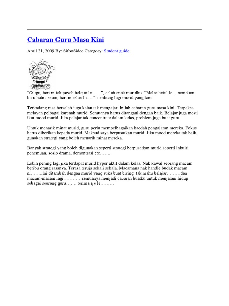 Cabaran guru masa kini. 8032017 Apakah cabaran yang dihadapi oleh guru masa kini. Cabaran Guru Guru Pendidikan Khas Abad Ke-21 Kemenjadian Murid Pembangunan Profesionalisme Abstract. Terlalu banyak benda perlu fokus Jadi persediaan mengajar bukan lagi menjadi satu objektif utama walaupun sebenarnya tugas guru adalah mengajar sebaik mungkin melalui perancangan dan bahan bantu mengajar hebat.